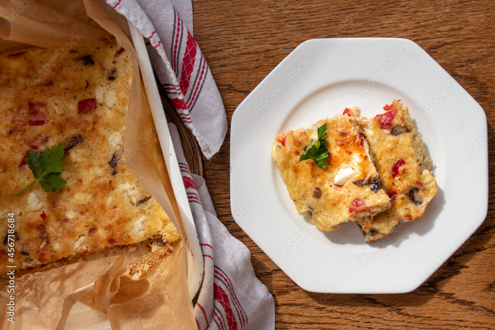 Homemade quark or curd casserole with mushrooms, red bell pepper and cheese. Healthy food, vegetarian protein-rich meal
