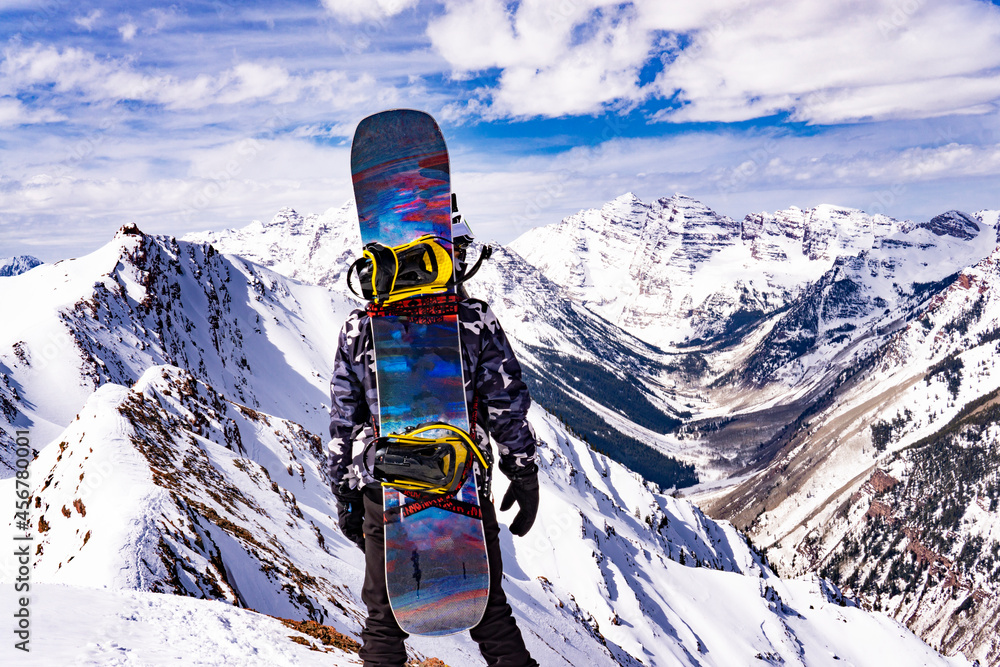 Snowboarder On Epic Mountain Summit Peak In Snow
