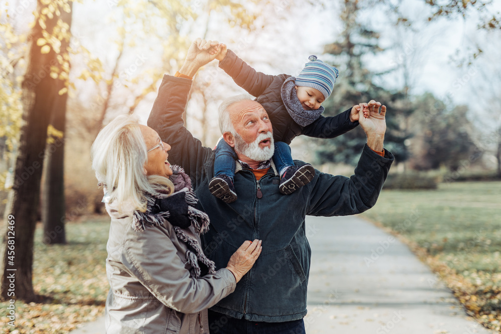 Happy good looking senior couple husband and wife walking and playing with their adorable grandson in public city park