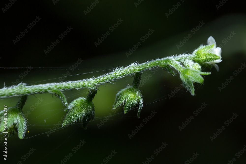 "The many explorations of the garden variety spider" - Silk of unknown sp. spider on budding flowers - Nebraska