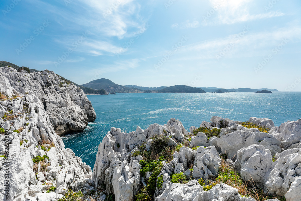 Calendar for September 23 : decorative house with the name of the month in English, number 23, yellow sunflower flower, scattered petals on a blue background, side view