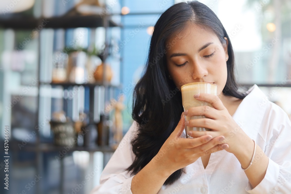 Portrait of Asian woman drinking coffee and have lunch in coffee shop.