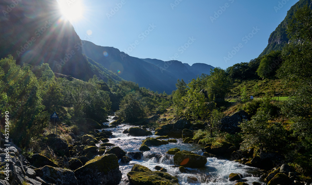 Torrente de agua en el río que sale del lago Bondhus, Noruega