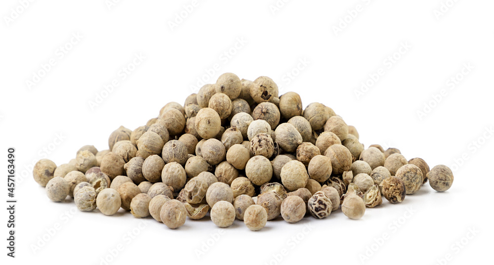 Dry white peppercorns heap on a white background. Isolated