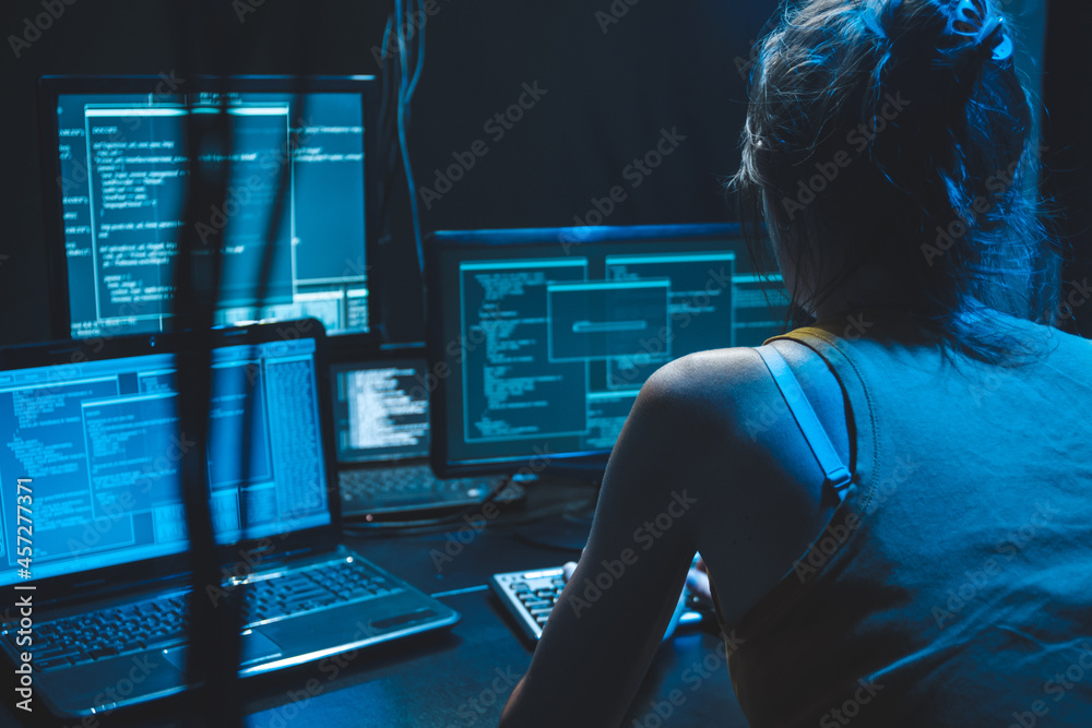 Programmer at night. Develops new web desktop mobile application. Software developer freelancer woman female work with program code on wide displays at night. Coder work on software program.