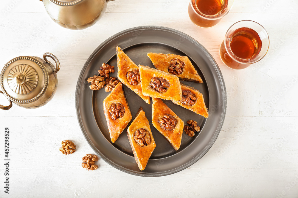Tray with tasty baklava and glasses of Turkish tea on light wooden background