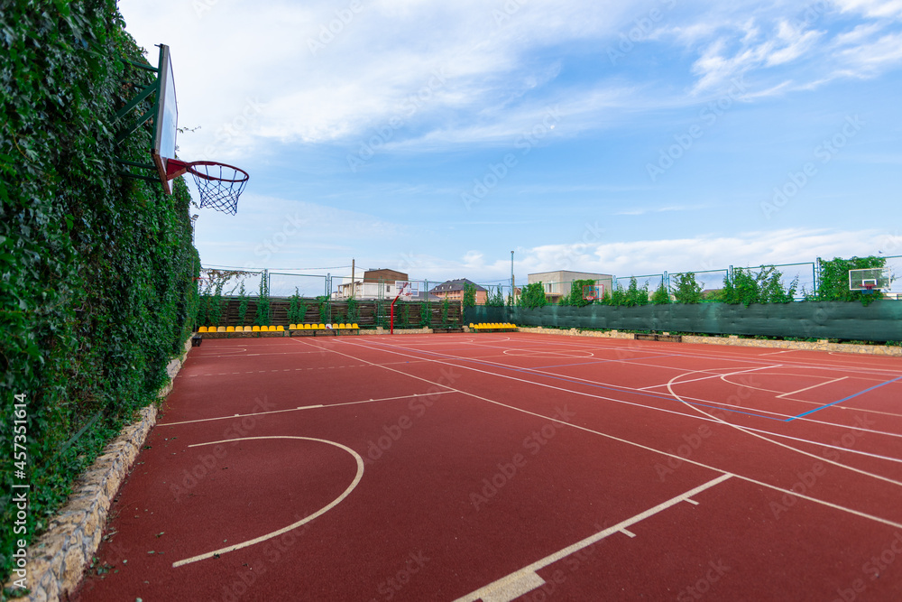 Red basketball court at day with blue sky. Sport concept