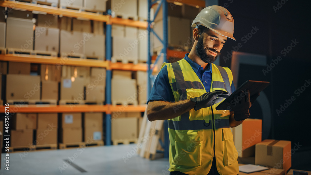 Outside of Logistics Retail Warehouse: Handsome Latin Manager Using Tablet Computer for Inventory. Delivery Service with Cardboard Boxes, Online Orders, E-Commerce. Evening Shot