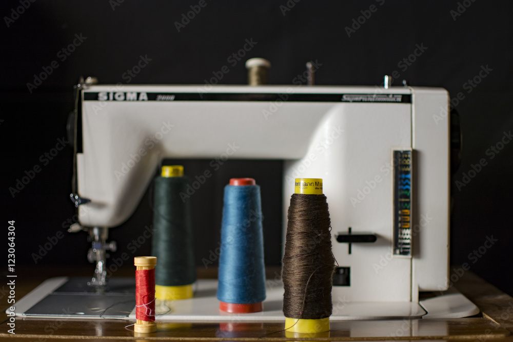 Sewing machine bobbins with colorful thread forming the shape of a heart, and a pincushion on a pink background