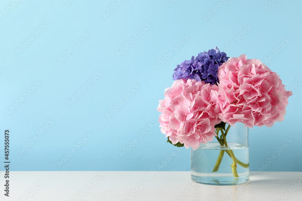 Vase with beautiful hortensia flowers on white table against light blue background. Space for text