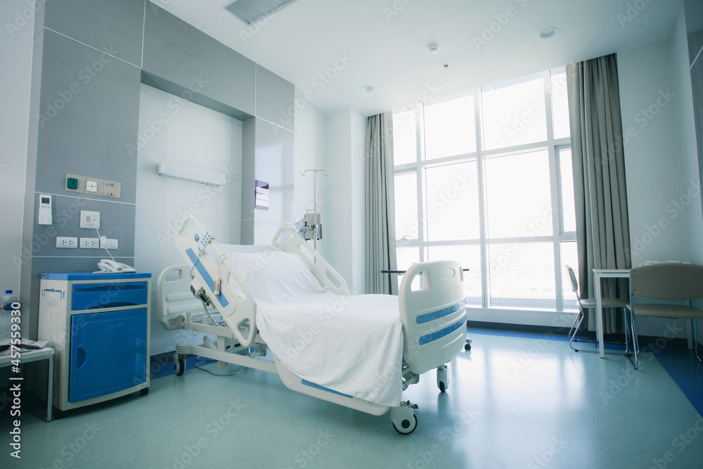 Recovery Room with beds and comfortable medical. Interior of an empty hospital room. Clean and empty room with a bed in the new medical center
