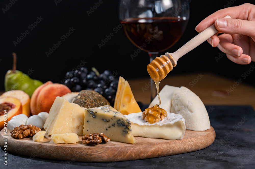 A female hand pours honey on camembert with walnuts using a special honey spoon. An exquisite combination of expensive delicacies. Close-up, black background.