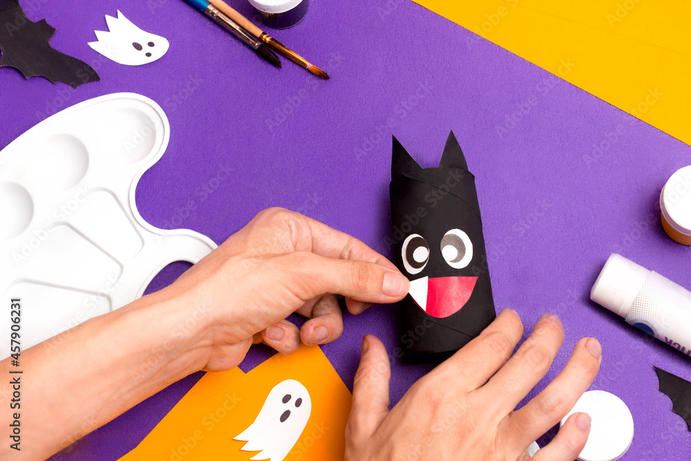 Handmade craft project toilet paper tube. Making cute monster for Halloween. Step by step photo instruction