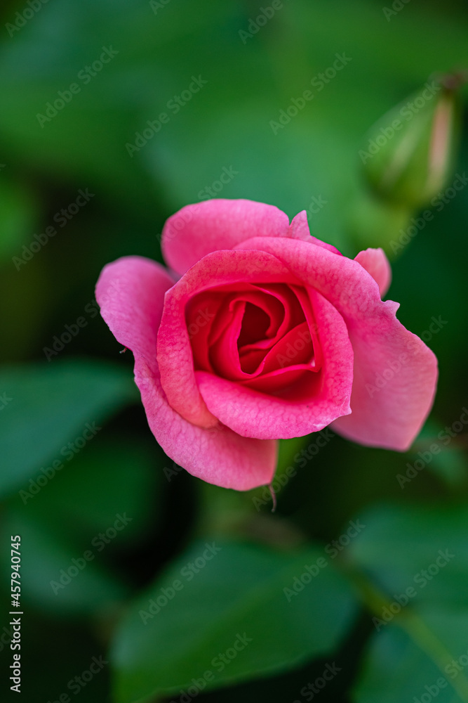 close up top view of a beautiful pink rose blooming on top of the bushes