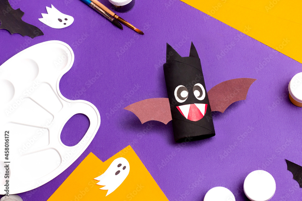 Handmade craft project toilet paper tube. Making cute monster for Halloween. Step by step photo instruction
