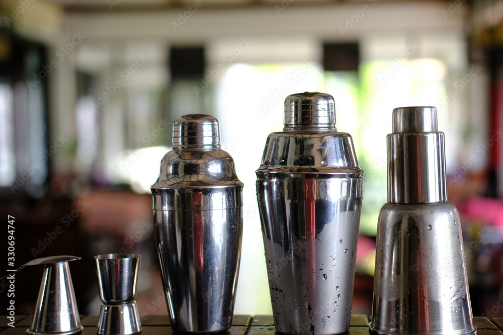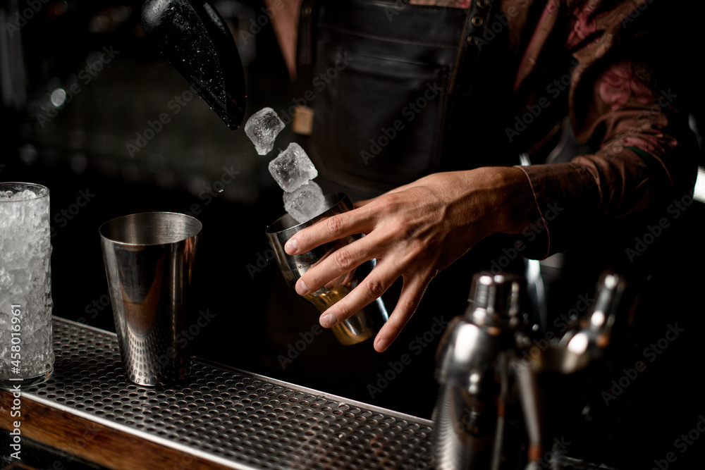 hand of man bartender holds shaker glass and pours ice cubes into it scoop