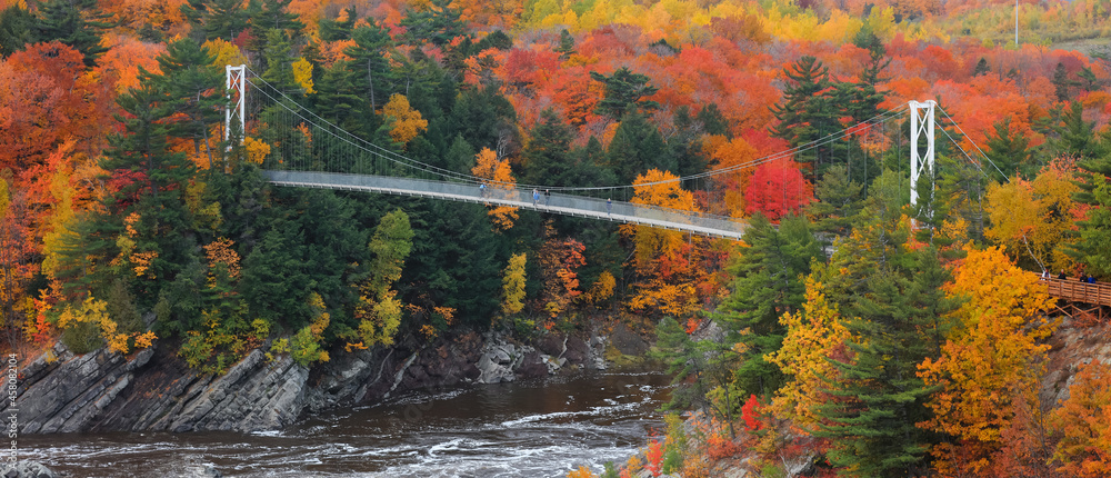 Chaudière River Suspension Bridge at Chaudière Falls Park surrounded with fall foliage.