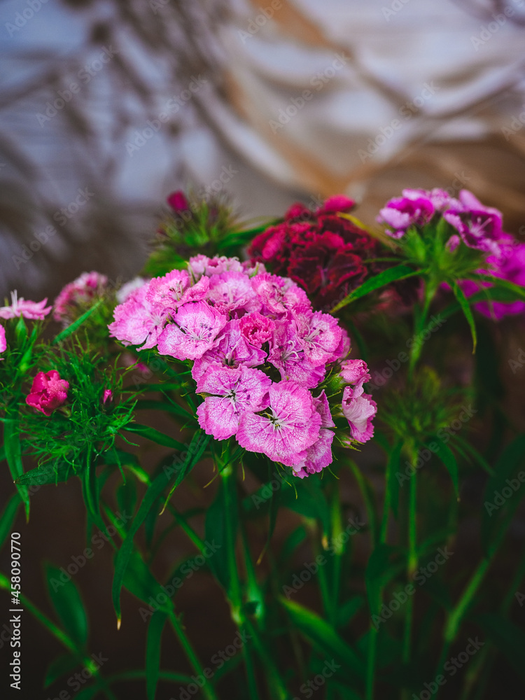 beautiful bouquet of flowers sweet william on the background of a stained glass window