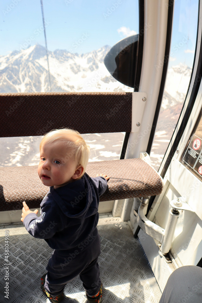 curious little child looking at the cable car window to the mountains