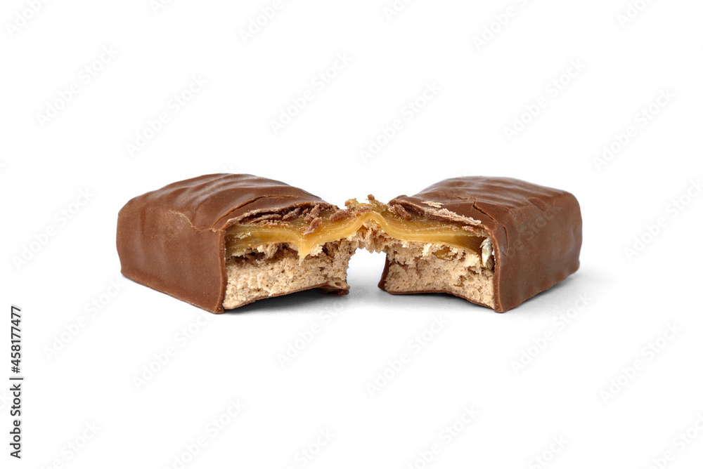 Broken chocolate bar with nougat and caramel isolated on white background.