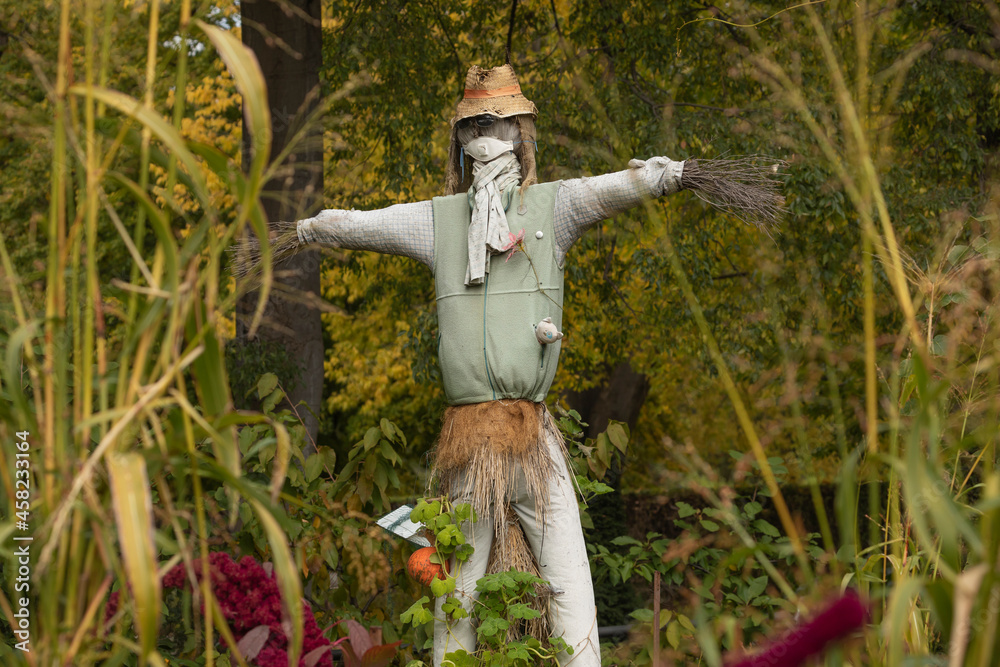 A funny scarecrow doll, wearing sunglasses and a shirt, in an urban garden in Madrid, Spain