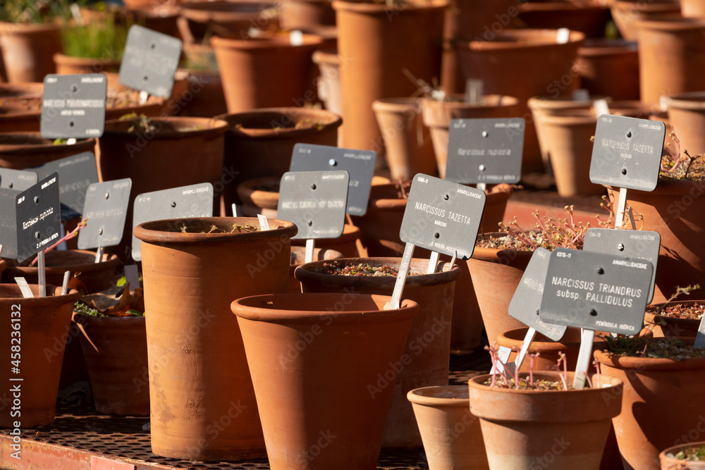 Piles of orange colored clay pots in a nursery of a botanical garden, in autumn, Madrid