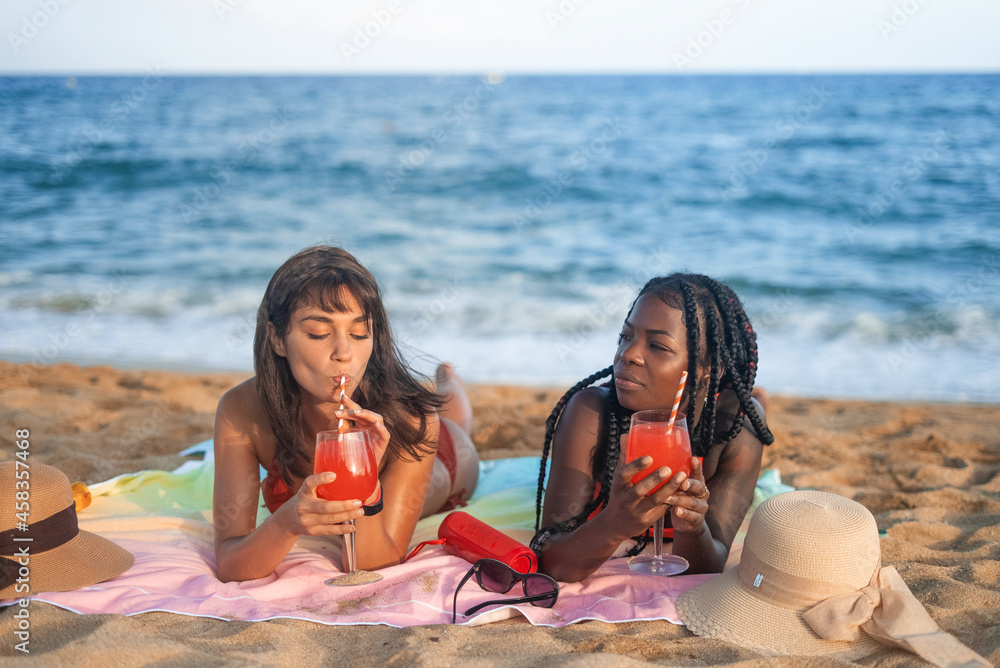 Girlfriends with cocktails resting on beach