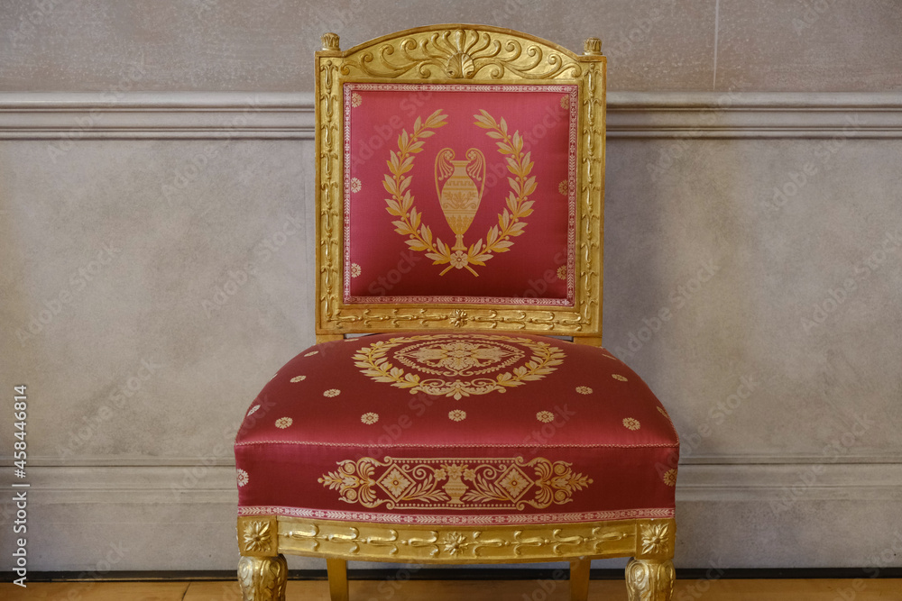Elegant, oppulent and antique furniture with wood inlays and gold plated ornaments marble wall details inside room of luxury estate palace castle in historic baroque or rococo interior design style