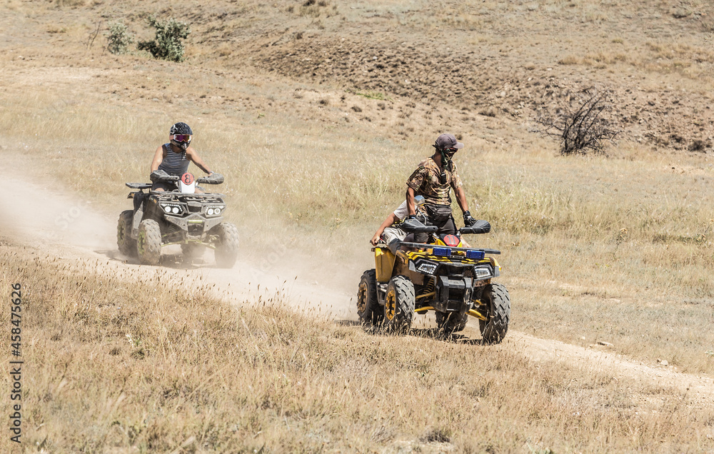 Men on ATVs move on a dirt road