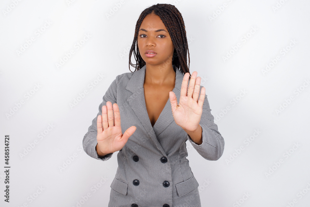 Young African American businesswoman with braids on white wall doing stop sing with palm of the hand. Warning expression with negative and serious gesture on the face.