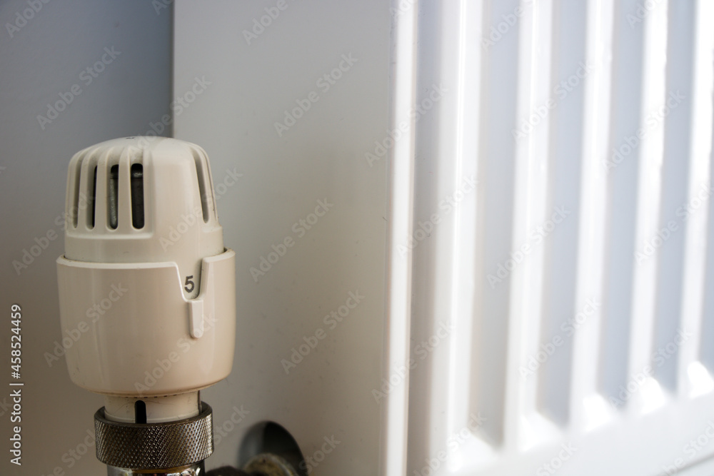 Thermostatic valve on radiator turned to highest number 5, close up