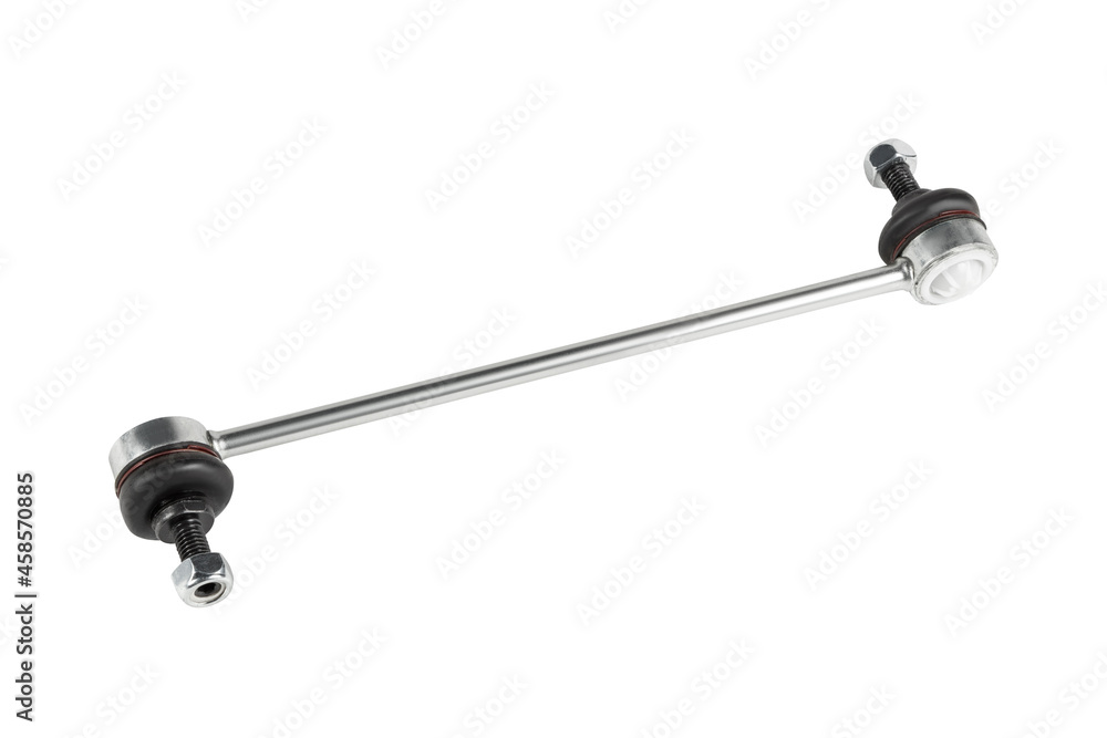 Steel front stabilizer link or sway bar for connecting wheels of vehicle isolated on white background