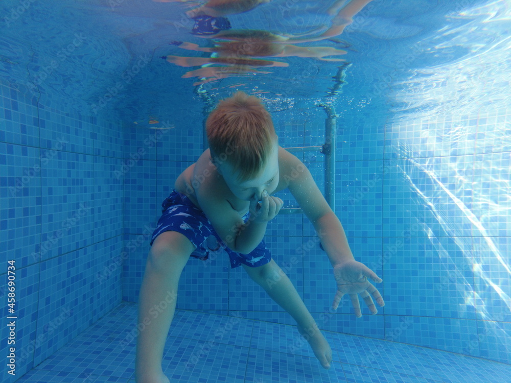 Larnaca, Cyprus - September 2021: A child dives into the pool. Summer vacation in the pool. A boy with a circle jumps into the pool.