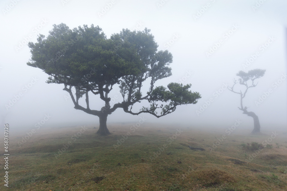 Magical endemic laurel trees in Fanal laurisilva forest in Madeira, World Heritage Site by UNESCO in Portugal. Beautiful green summer woods with thick fog Rainforest in rainy day. Solitary trees.