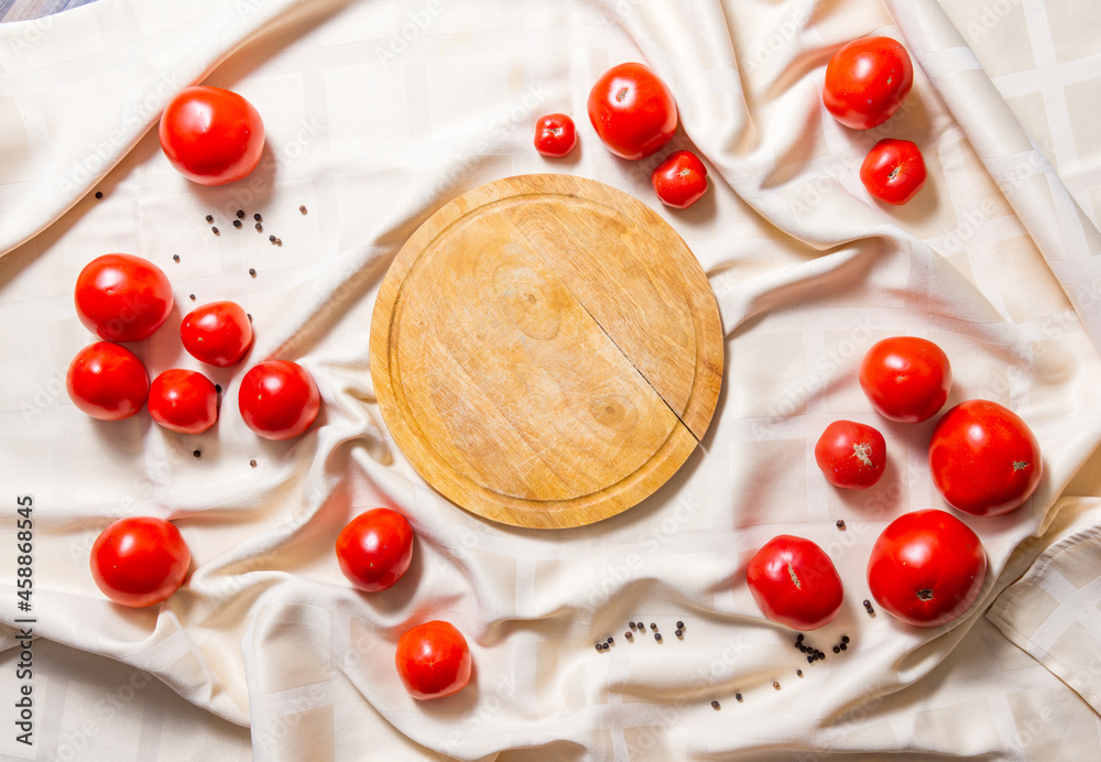 Round wooden cutting board, in around the edges are red ripe tomatoes on a tablecloth.