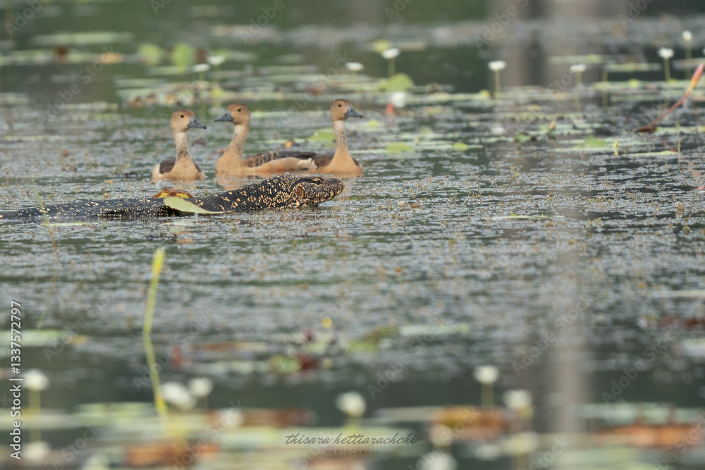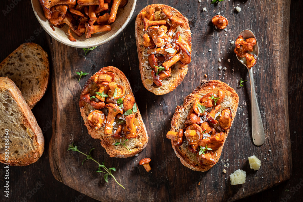 Gruppe gelber Pilze, die in einer Reihe stehend, auf einen alten Stück Holz wachsen. Auf einen Pilz sitzt eine einzelne Mücke.