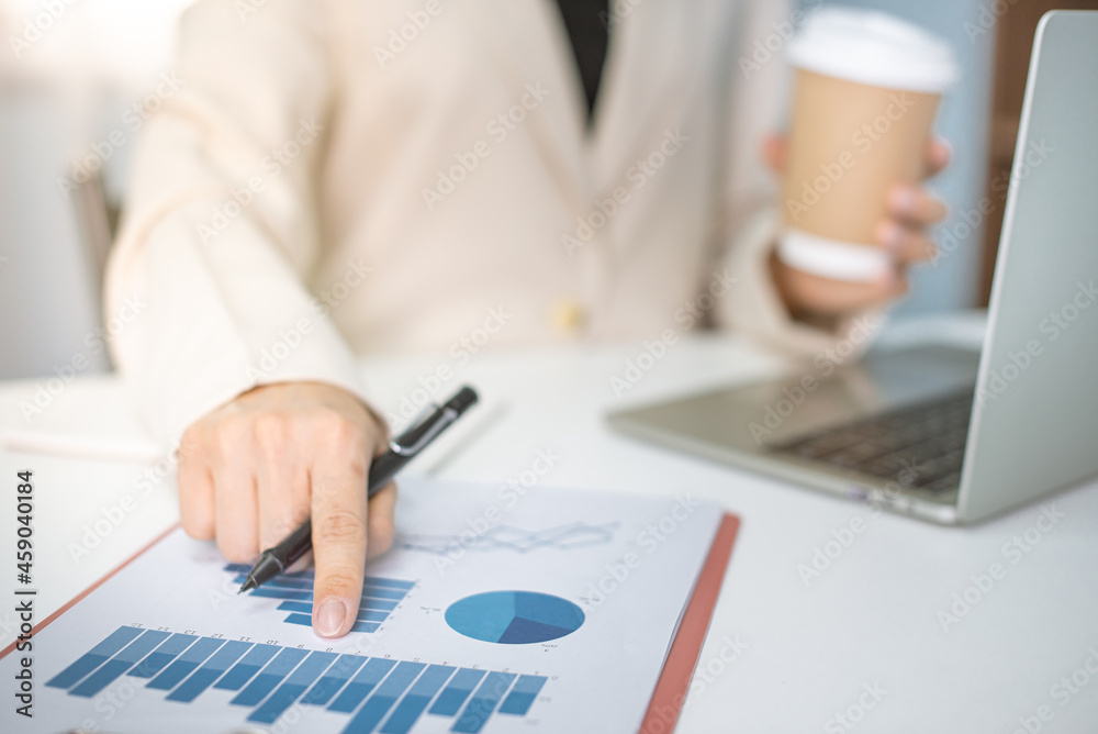 Business woman in suite working with documentary data on white desk at office, Business accounting and financial concept