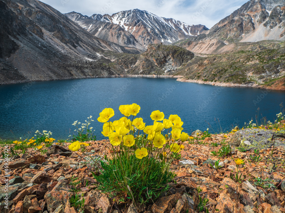 Lush yellow poppy flowers bushes on the background of blue lake and snow high mountains.