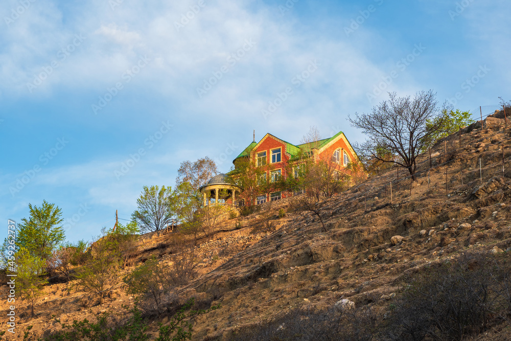 Red house on the top of a mountain. Guest house in Gunib village. Dagestan.