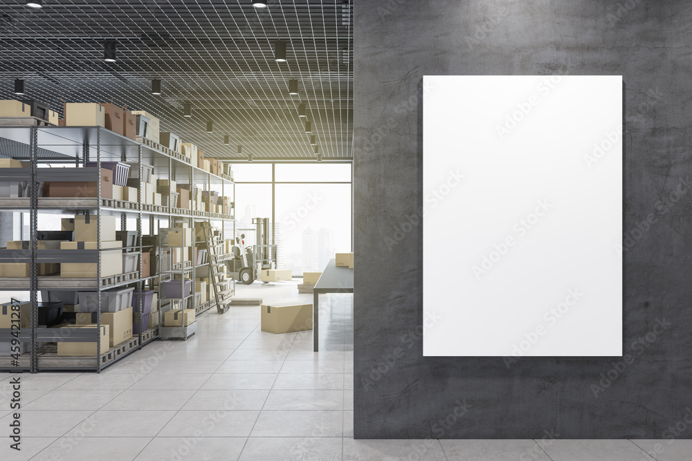 Contemporary warehouse interior with empty mock up poster on wall, racks, boxes, city view and daylight. Logistics and shipping concept. 3D Rendering.