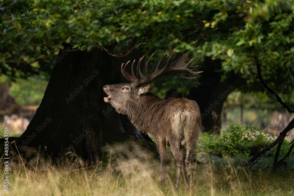Red deer roar in the forest. Deer during rutting time. Autumn in the wildlife. European nature.