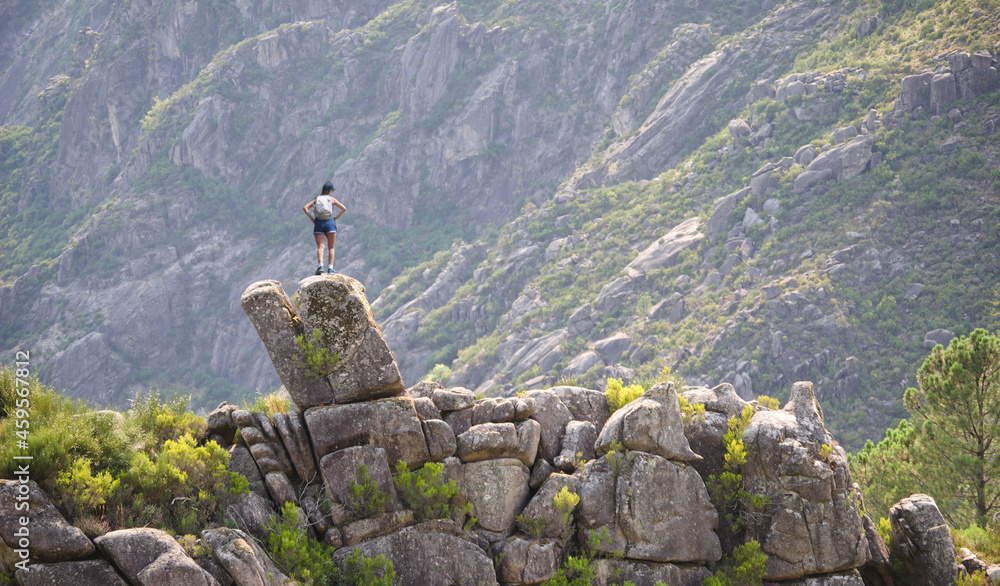Rapariga no topo de uma pedra no cimo de uma montanha a ver a paisagem, escalada