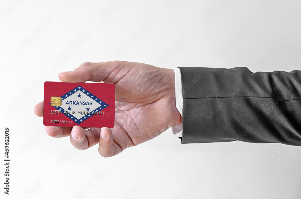 Bank credit plastic card with flag of USA state Arkansas holding man in elegant suit