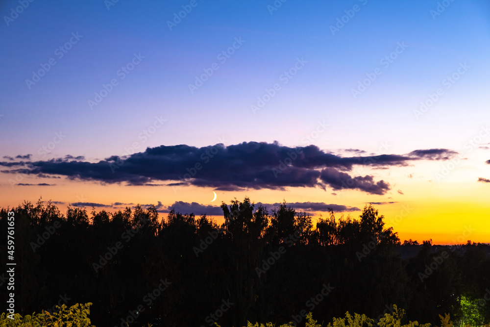 A month among dark clouds in a blue-orange sky and silhouettes of trees.