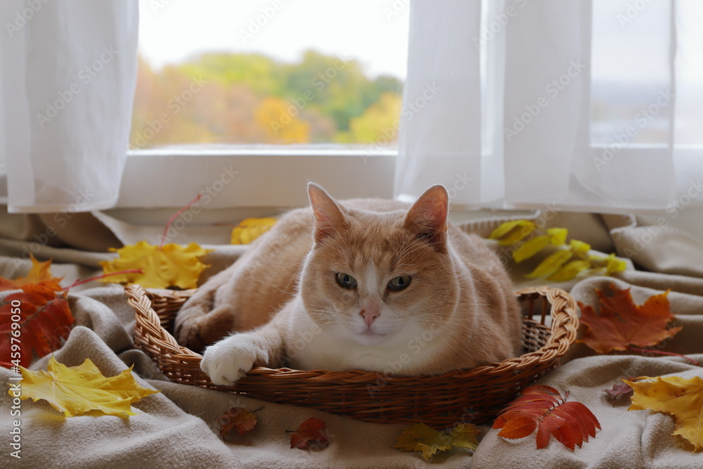 Red cat is in wicker basket among foliage in front of the window on the background of autumn landscape.
