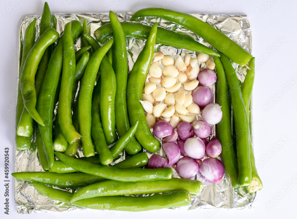 Top view of raw green chilli, garlic and onion on aluminum foil tray before place into oven to bake. Full frame photo on white background with copy space.