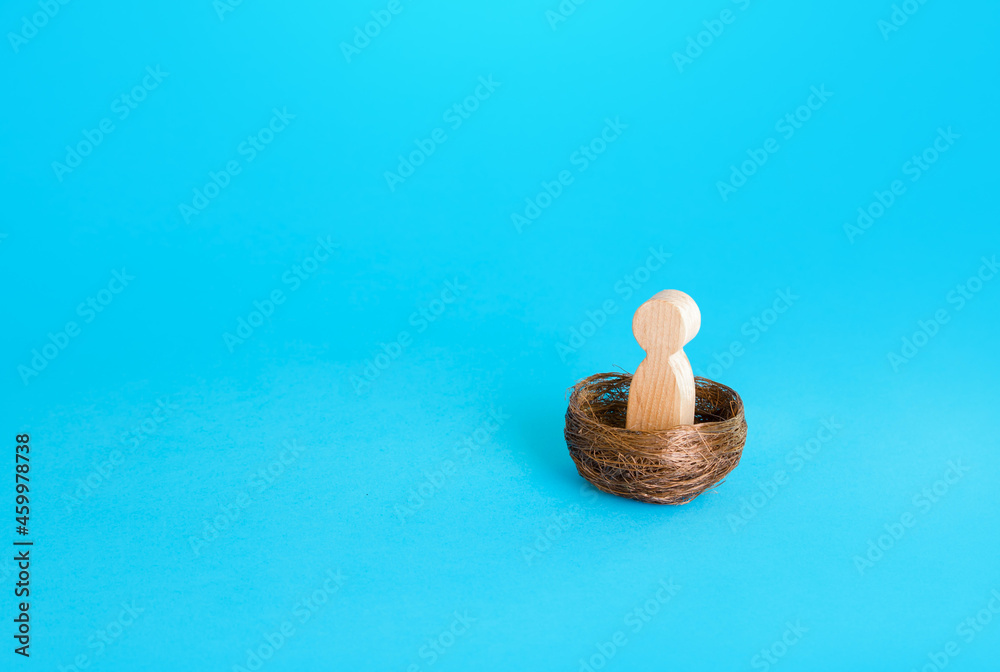 Man in a bird's nest. Introvert concept. Safety, security, peace of mind. Imaginary security. Life health insurance. Comfort zone. Housing and real estate. Birth and procreation. Infertility treatment