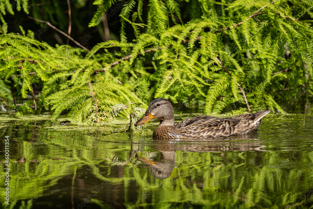 a female duck swimming by the edge of the pond by the trees with reflection on water surface