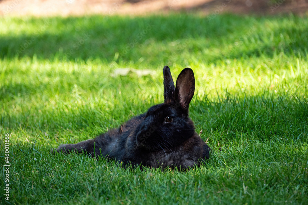 a cute black rabbit laying on the green grass take an afternoon nap in the park