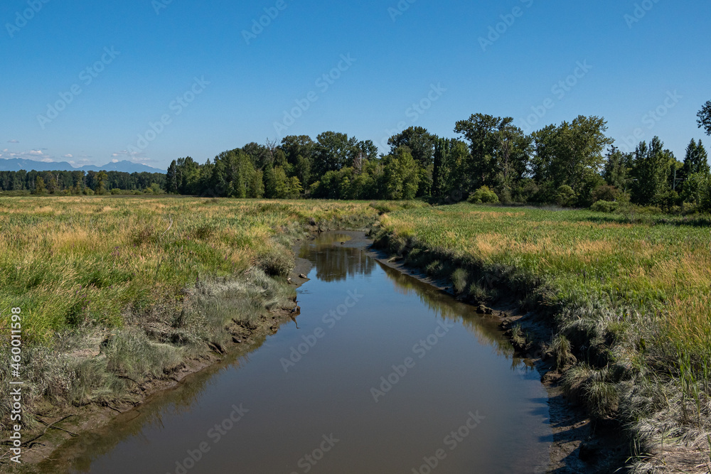 waterway in the wetland lead to the far end forest under the blue sky